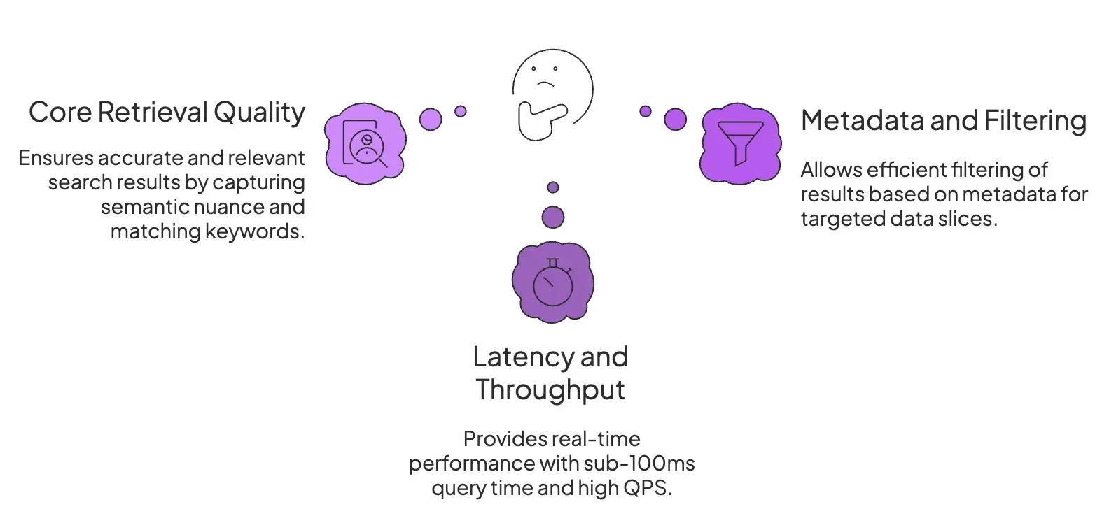 When comparing vector databases for RAG, our evaluation focused on three core pillars that matter most in a RAG pipeline.
