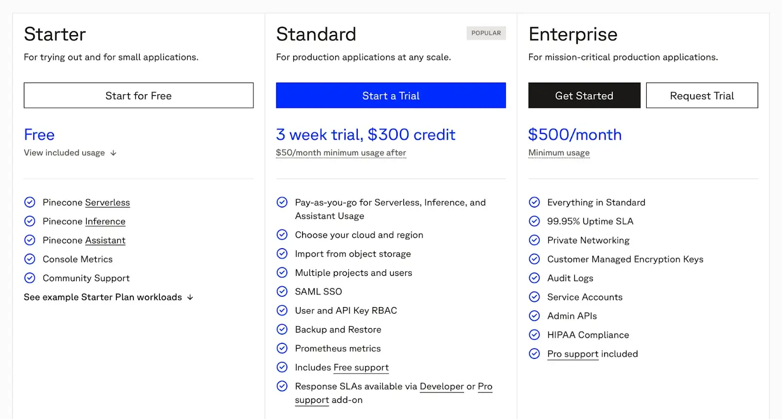 Pinecone offers a usage-based pricing model with a free ‘Starter’ tier. The Starter plan (no credit card required) includes up to 2GB of storage, 2 million write units, and 1 million read units. Beyond free usage, it has two paid plans:
