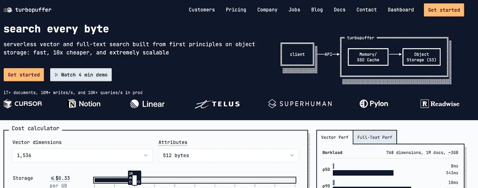 - Turbopuffer: An S3-based serverless vector + text search engine. Cost-effective with built-in hybrid search even on low tiers.