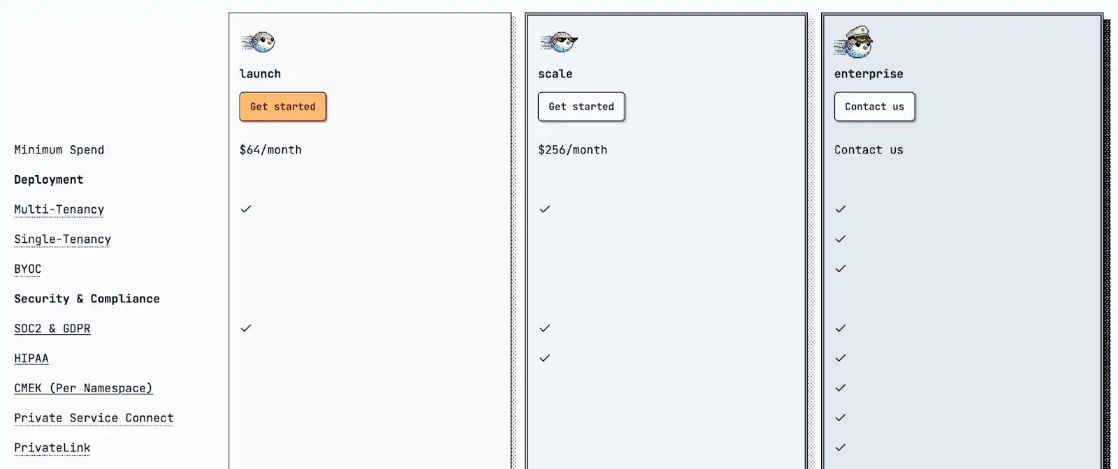 Turbopuffer offers plan-based pricing with a minimum monthly spend. It has three plans: