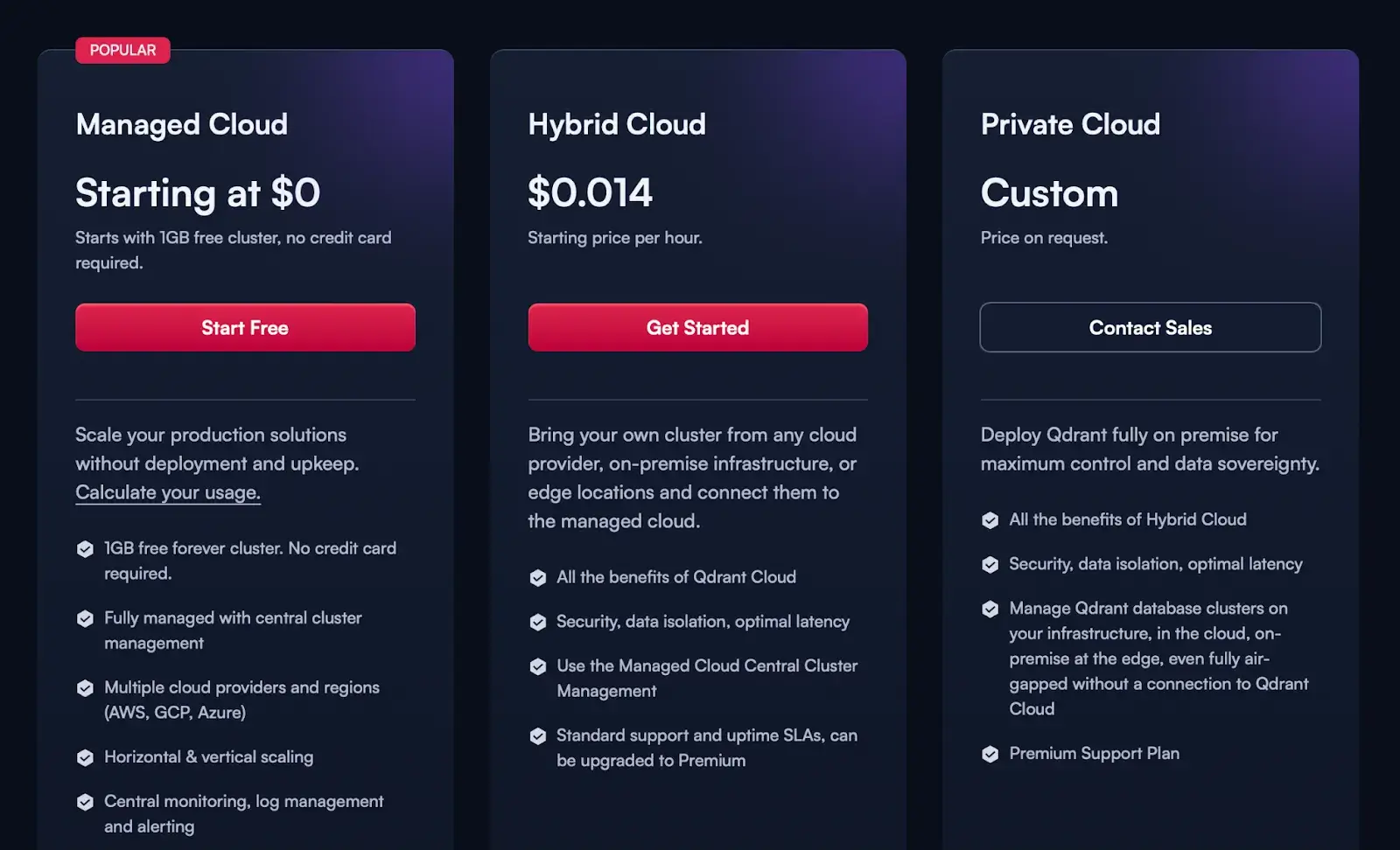 Qdrant itself is open-source. The Qdrant Cloud service offers a free 1GB cluster. Beyond free usage, managed clusters are usage-based: