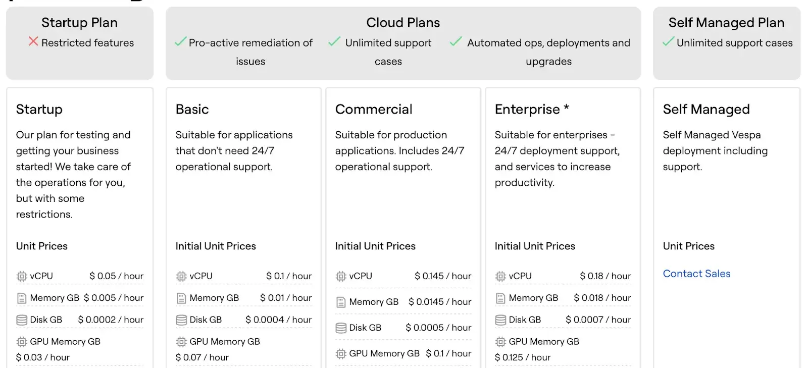 Vespa itself is open-source (Apache 2.0) and can be self-deployed at no software cost. They also offer Vespa Cloud, a managed service with usage-based pricing based on allocated resources (vCPU, memory, disk) per hour, with different tiers for support and features.