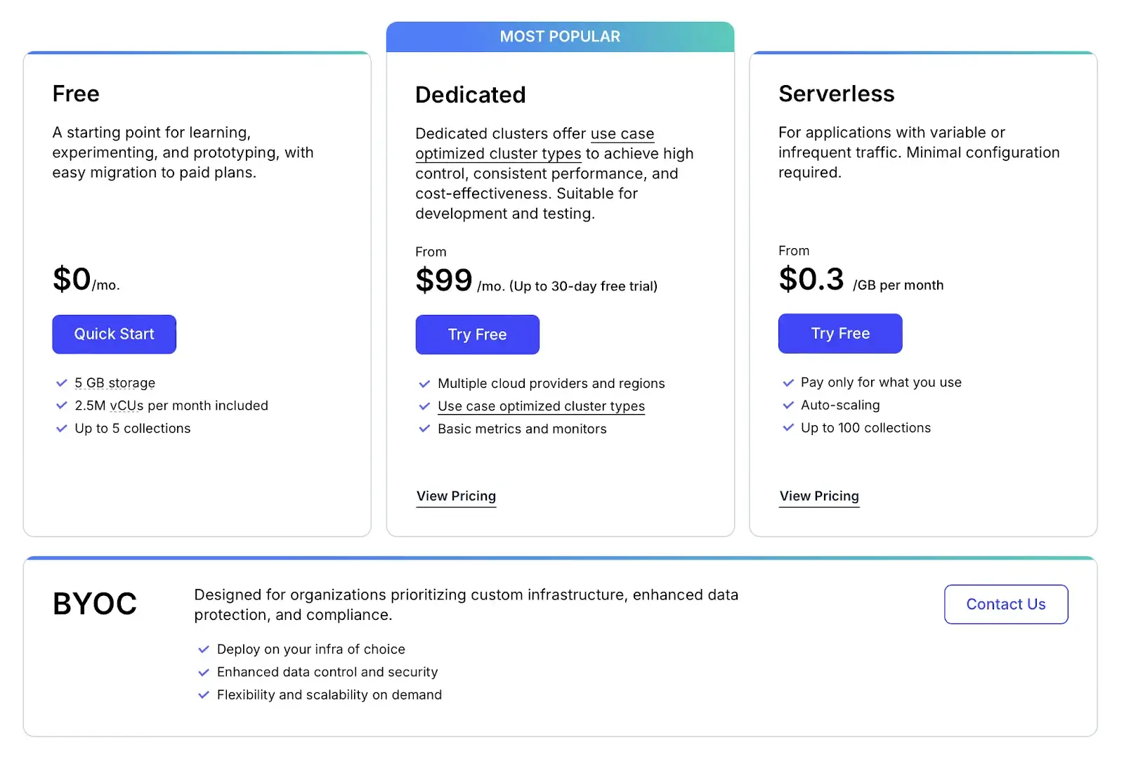 Milvus itself is open-source. Zilliz offers Milvus as a managed service. The free tier includes 5GB of storage (~1 million vectors). Beyond that, you can choose from three paid plans: