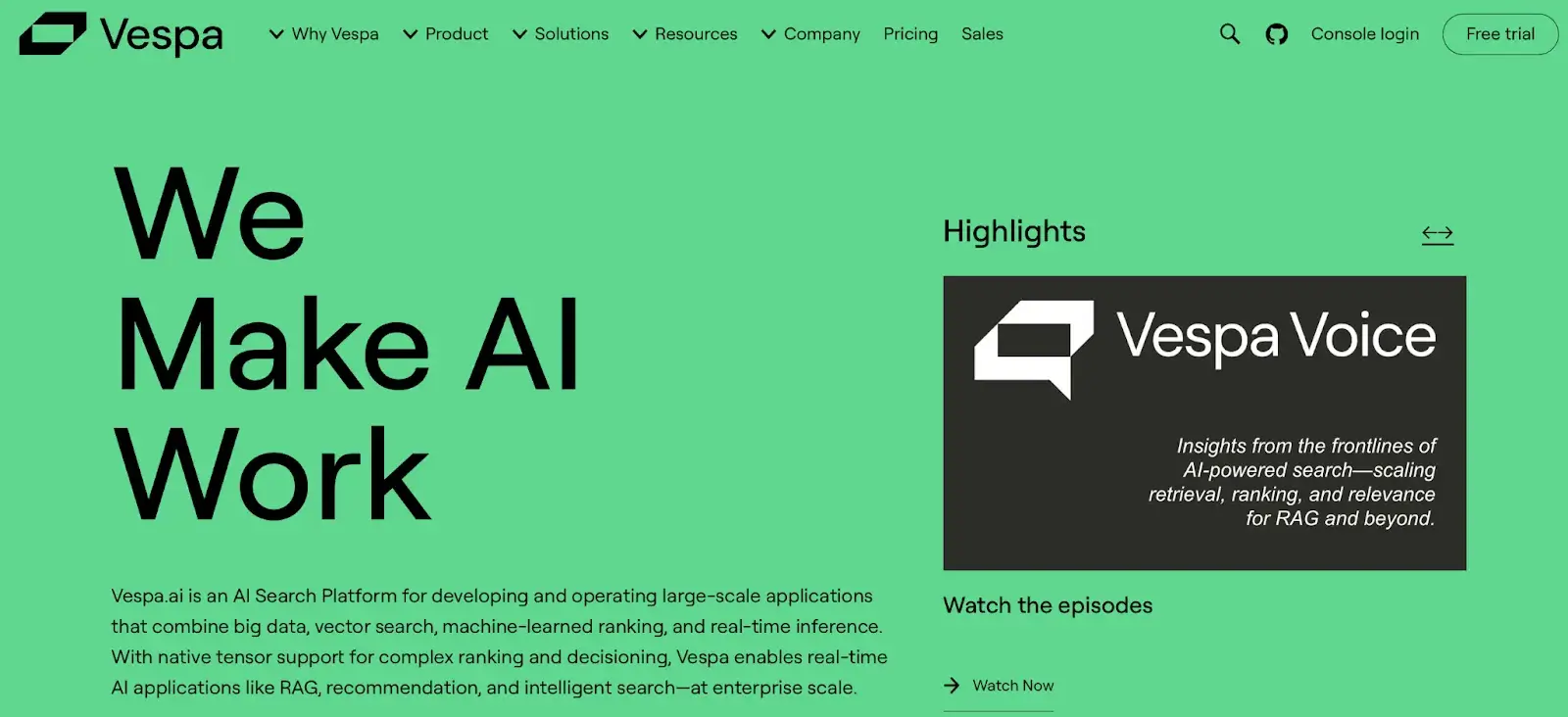 Vespa is a powerful open-source engine for big data and AI. It functions as both a fully-featured search engine and a vector database. It’s designed for real-time applications that combine vector search, lexical search, and machine-learned ranking at scale.