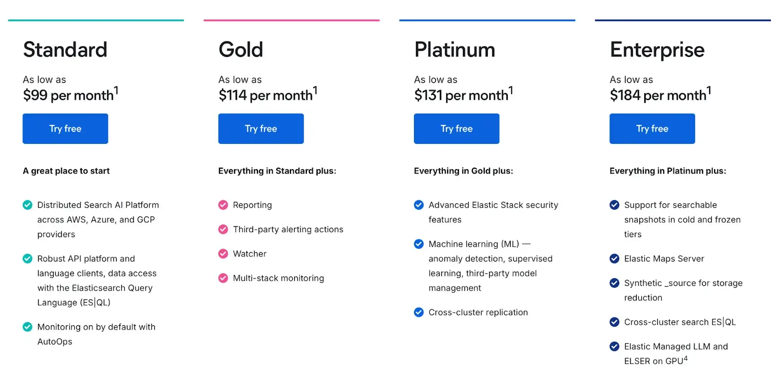 Elasticsearch is open-source, but the managed service is popular. On the Elastic Cloud Hosted plan, you have three paid tiers: