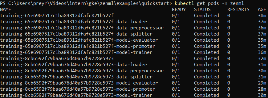 - If all went well, you should now see the logs of all Kubernetes pods in your terminal. When running kubectl get pods -n zenml, you should also see a pod created in your cluster for each pipeline step.